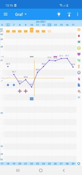 @any_soj Dakujem, toto som chcela vediet, nejak som to nikde nenasla. Takto vyzera graf. Ten predovulacny vzostup, to nic, tam som to merala v ine casy,...tie kriziky su pozitivne ovulacne testy, boli 2 dni a treti uz bol negat., potom sa zdvihla teplota. Dnes je 7 DPO a pokles mierny. No uvidime teda.