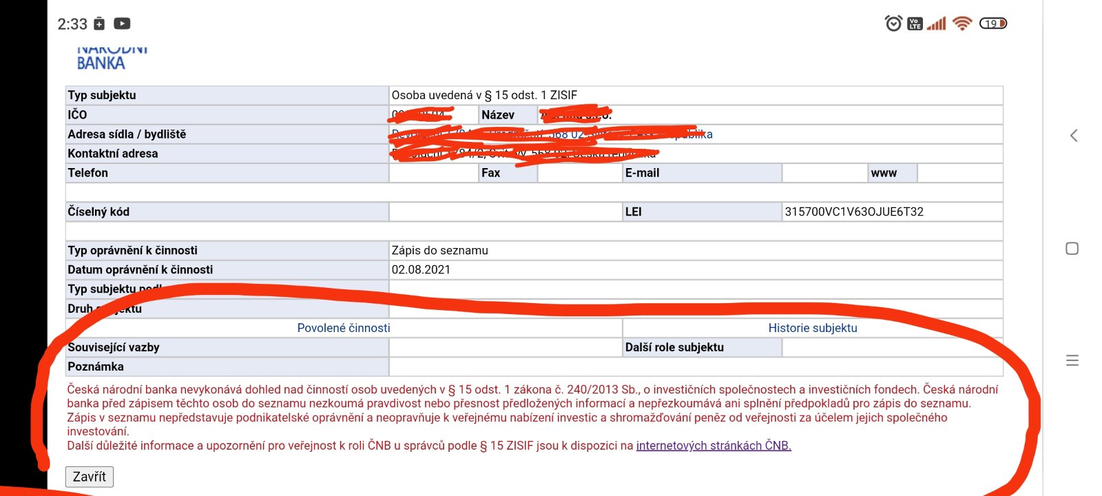V oficiálnom registri ČNB som pri vyhľadávaní tejto spoločnosti našla upozornenie, ktoré má zmiatlo (prikladám scan z vyhľadávania).
