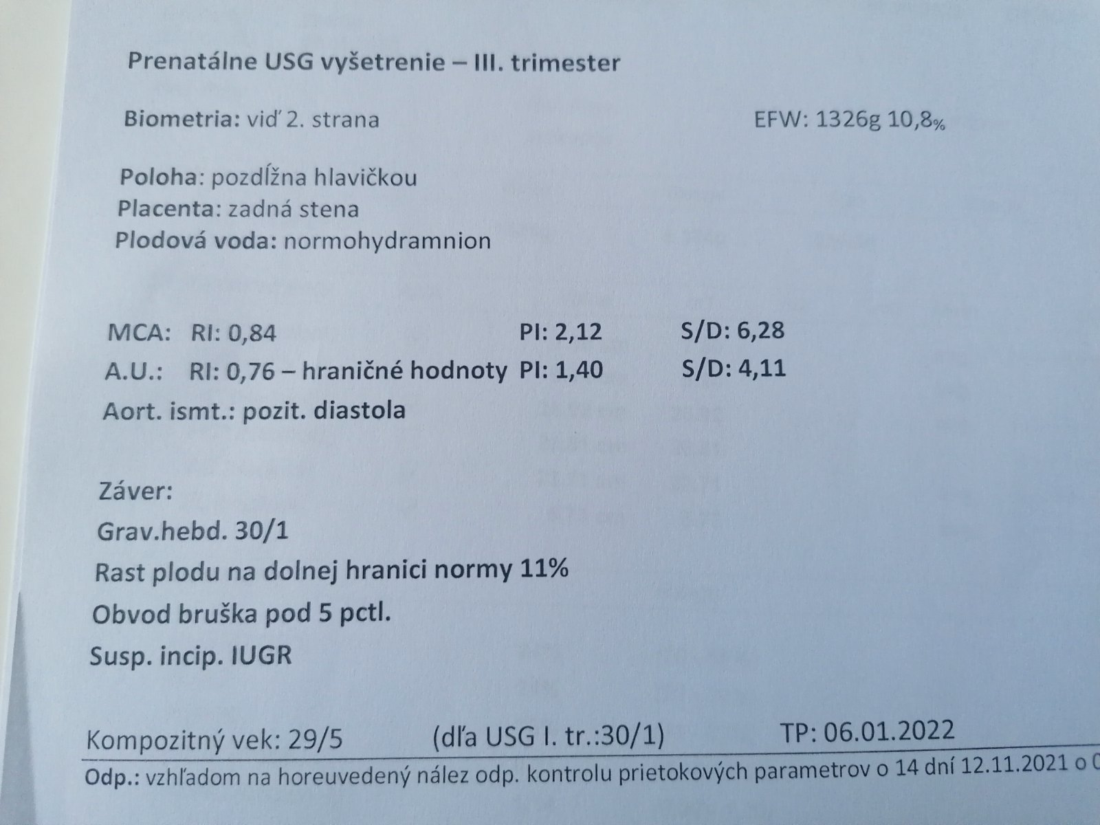 Zatiaľ máte síce výsledky prietokov na daný týždeň tehotenstva hraničné, ale nie patologické. Dobrým základom je pozitívna diastola. Je však nutné počkať do ďalšej kontroly, kde Váš lekár skontroluje prietoky a opakovane zmeria váhu plodu, kde sa ukáže či podrástlo. Pokiaľ bude pekne rásť, nie je sa čoho obávať.