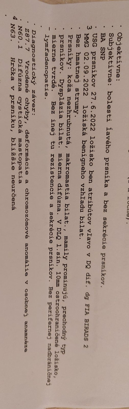 Celkovo je nález v poriadku, je potrebné prsníky iba pravidelne sledovať /samovyšetrenie, MMG a prípadne USG podľa doporučenia/.
