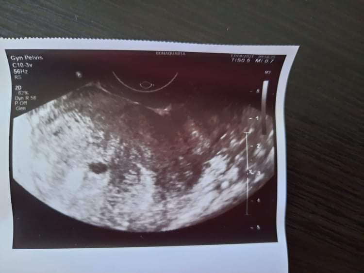 fotka je trochu rozmazaná a zle osvetlená, ale na prvý pohľad by som povedala, že ide o počínajúce tehotenstvo. Potvrdiť ste si daný nález mohla tehotenským testom, prípadne Vám gynekológ mohol odobrať krv na hCG.