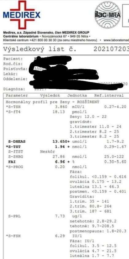 Máte zvýšené hodnoty androgénov - S-TST /testosterón/, FAI /frakcia voľného testosterónu/, DHEAS /prekurzor testosterónu/. Prejavmi sú akné, hirzutizmus, virilizácia a poruchy plodnosti. Androgény sú produkované vaječníkmi, ale tiež nadobličkou. DHEAS výlučne nadobličkou.