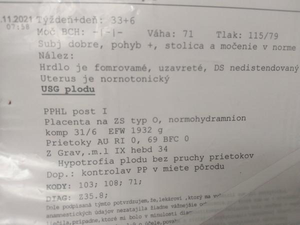 bábätko zaostáva v raste cca 2 týždne. Prietoky v pupočníku, ktorými posudzujeme funkciu placenty či inú prekážku prietoku krvi k bábätku sú v poriadku. Preto vieme predpokladať, že kyslíka a živín má dosť.