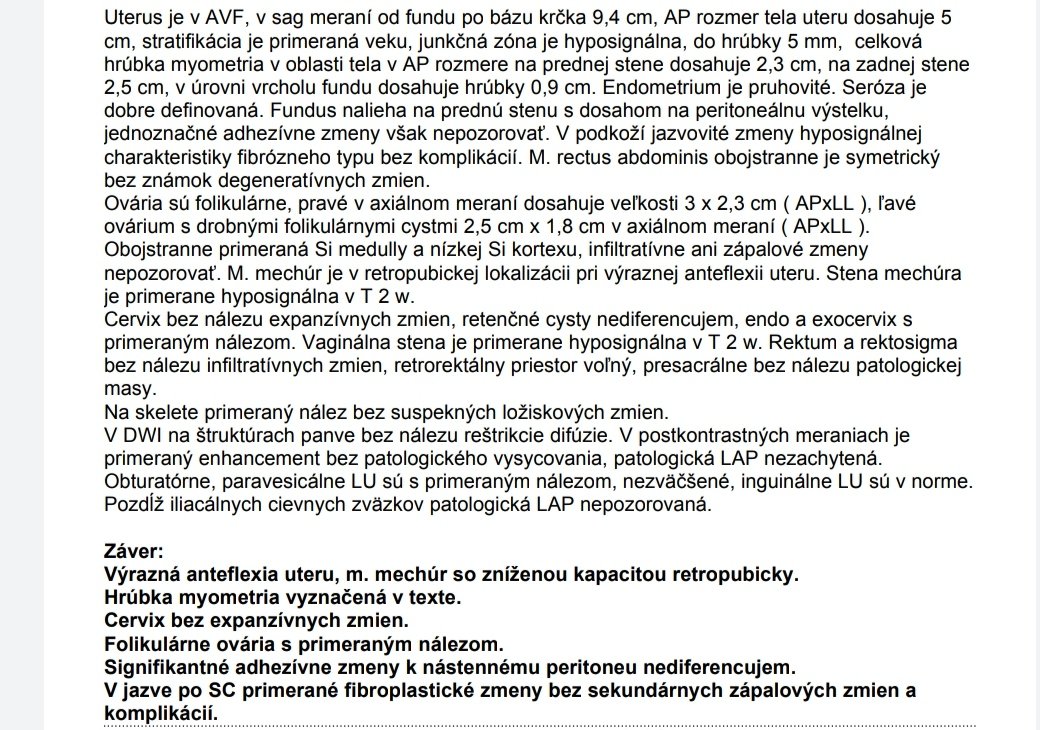 chcela by som vedieť váš názor ako odborníka. 29. 12. 22 mi začala MS. Do dnešného dňa sa mi MS nerozbehla, len cítim tlaky a bolesť v podbrušku už nejaké 4 dni. Mala som nechránený styk, no dávali sme si pozor. Mám 28-dňový cyklus a doteraz mi MS nevynechala. Pár dní pred som už mala také špinenie, teraz nič. Pre istotu som si dnes ráno robila aj tehotenský test, bol negatívny. Všade píše, že dva dni pred MS by už ukázalo tehotenstvo. Mám 37 rokov. Ovuláciu neviem kedy, a či vôbec prebehla. 3. 1. som bola na MR. Prikladám výsledok.