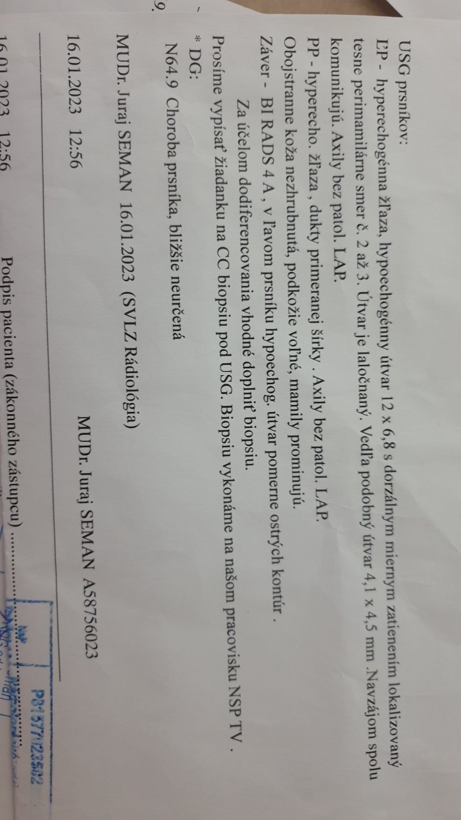 Vyšetrujúcemu lekárovi prišiel Váš nález podozrivý, preto sa pre istotu v ďalšom postupe rozhodol pre jeho bioptizáciu.