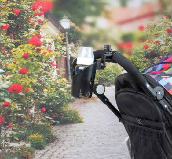 Je vhodný na väčšinu typov kočíkov. Jeho použitie je veľmi jednoduché. Dve plastové klapky držia na konštrukcií pevne na svojom mieste. Vďaka tlačidlám možno držiak nastaviť do potrebného uhla. Jednoducho sa pripevňuje aj odníme.