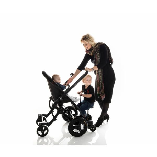 Ja osobne by som na konštrukciu nič moc nepridávala, ani keby to šlo - nie je na to stavaná. Ak ale teda fakt už, tak potom prídavný jednoduchý sedáčik na bok - Buggypod. To je maximum, čo ti tento kočík umožní - a bude to relatívne ok. Ak staršie dieťatko už samostatne a bez problémov sedí a obsedí, mohlo by to vyhovieť. Rátaj samozrejme s tým, že ako akýkoľvek prídavný sedák či skejt ti to manipuláciu mierne sťaží, ale dá sa to - ak to treba, zvládnete to.