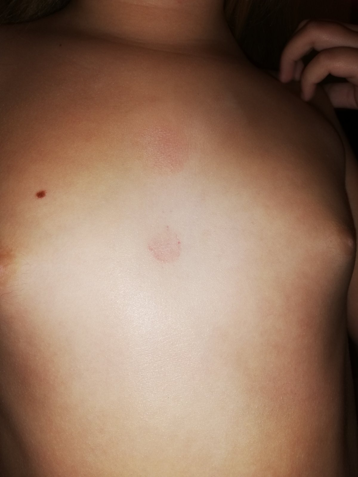 moja 7 ročná dcérka má už dlhšiu dobu takéto fľaky. Na chrbte ich je veľa a spredu na hrudníku sú iba 2. Krémy z kožného nezaberajú. Niekde vyzerajú skôr ako modrinky.