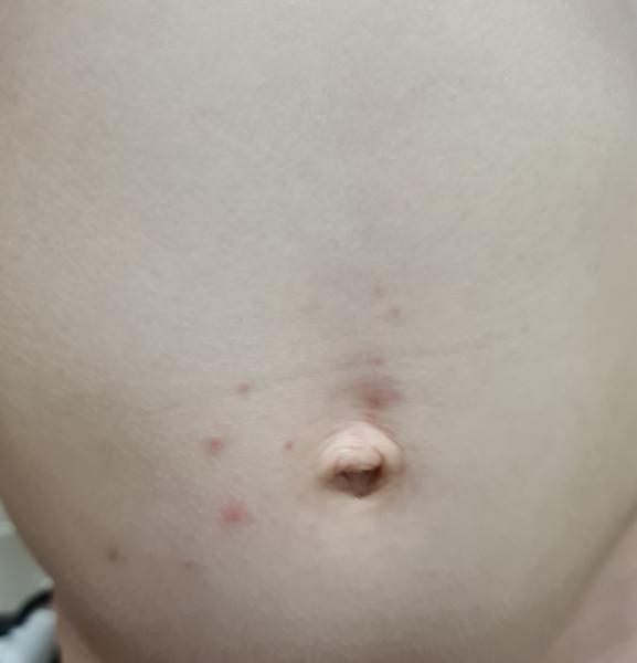 Na brušku je výsyp úplne iný, pravdepodobne nesúvisiaci s ostatnými vyrážkami, alebo ho svrbel v noci a rozškriabal si to.