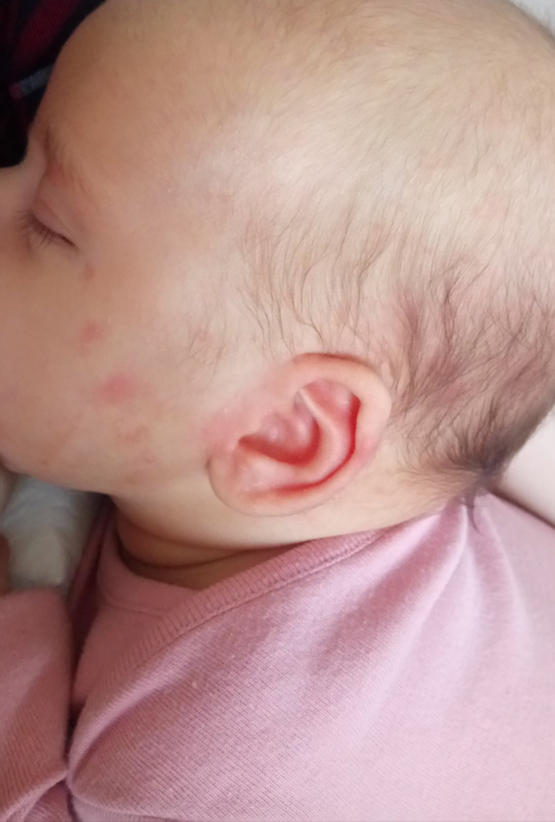 dcére sa v 4. týždni objavili na temene a na viečkach červené fľaky a bodky. Keď plakala, tak sa jej objavili aj fliačky s bielou bodkou v strede na lícach a krku. Dostali sme Holtov krem.