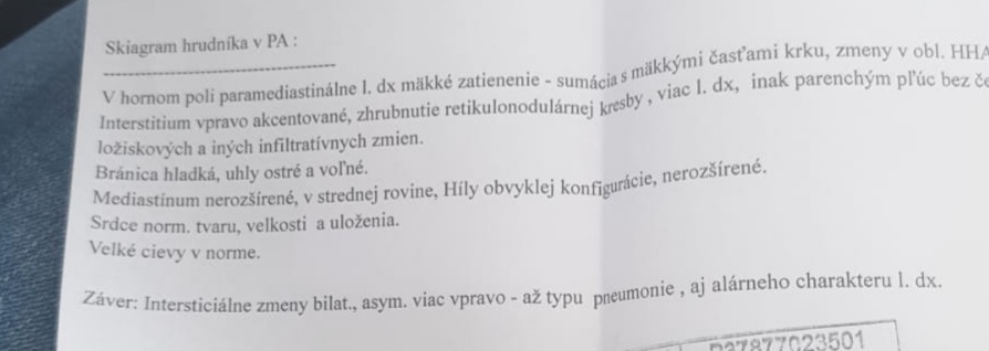 zmeny naznačujú možný zápal pľúc. Musí sa hodnotiť vzhľadom ku klinickému stavu.
