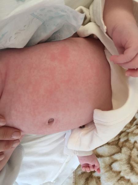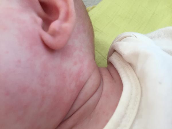 Ide o pomerne škaredý výsyp, pravdepodobne zo stravy/oblečenia. Treba jej nasadiť antihistaminiká - Fenistil 3x denne po 3 kvapky.