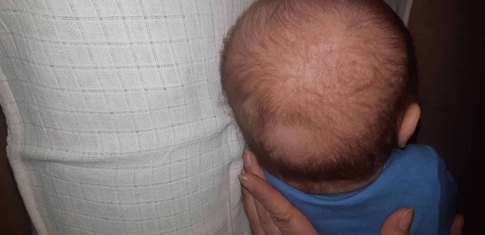 to čo ja na fotke vidím tak typicky znížený rast vláskov na temene hlavy dieťatka, ktoré je úplne bežné a je spôsobené spánkom dieťatka viac na temene. Má to takmer každé dieťatko. Preto ich treba polohovať pri spánku (hlavičku do bokov), aj keď dvojmesačný už si s hlávkou robí čo chce, takže sa to odporúča najmä do 2 mesiacov.