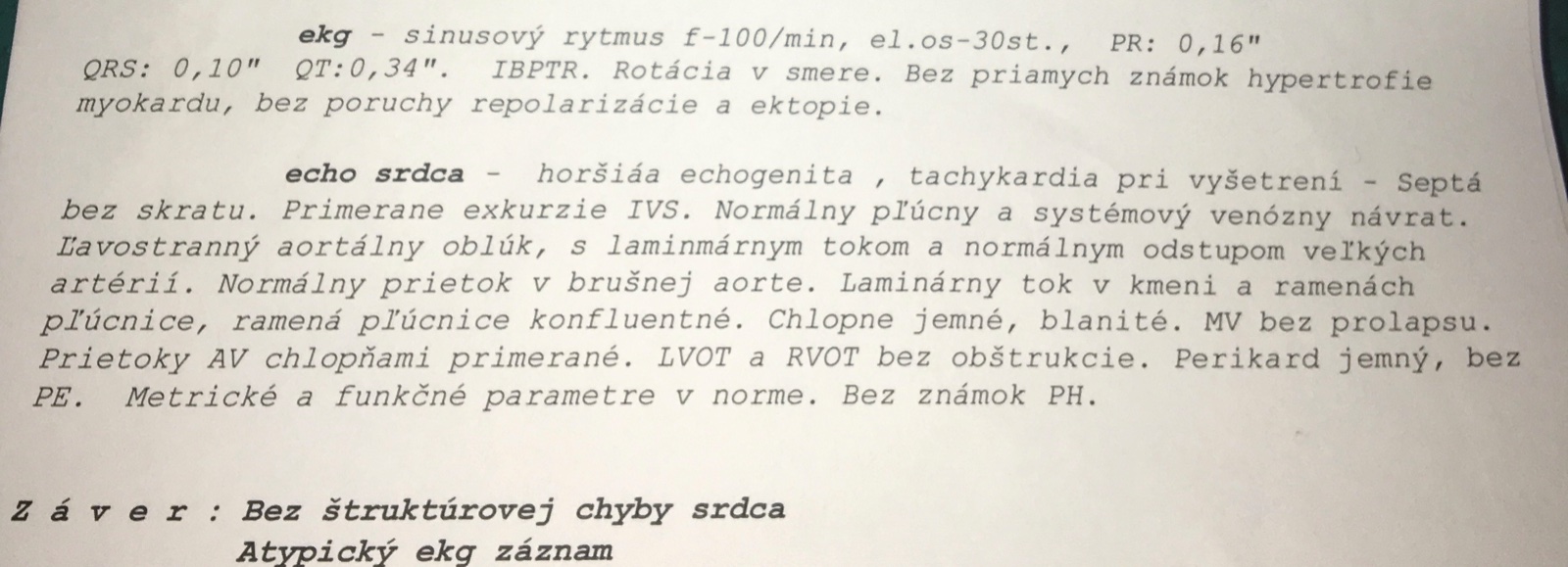Extrasystoly, preťaženie srdca a ani prevodové poruchy neboli zachytené.