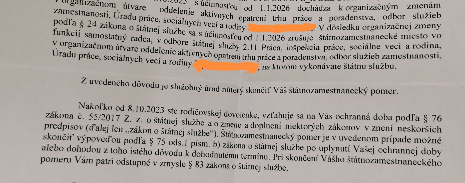 momentálne som ešte na rodičovskej dovolenke. Moje dieťa bude mať 8.3.2026 tri roky a som aktuálne tehotná. Nástup na materskú dovolenku, ak by som sa rozhodla ísť šesť týždňov pred pôrodom, by mi mal vyjsť 22.4.2026. V práci som mala pracovný pomer, avšak k 1.1.2026 mi zrušili pracovné miesto. Povedali mi, že som v ochrannej lehote, pretože som na rodičovskej dovolenke, a teda mi nemôžu dať výpoveď k tomuto dátumu. Ukončenie pracovného pomeru by mohli uskutočniť až po skončení ochrannej lehoty.