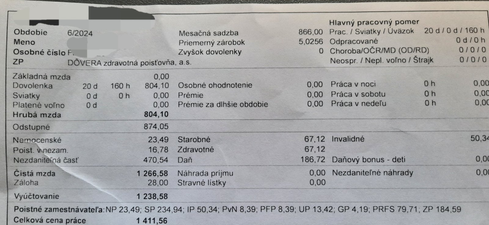 chcela by som sa poradiť ohľadom výplatnej pásky za mesiac 6/2024. Celý mesiac som čerpala dovolenku z dôvodu ukončenia pracovného pomeru. Moja hrubá mzda od januára 2024 bola 866 EUR a v júnovej výplate mi bolo vyplatené aj mesačné odstupné.