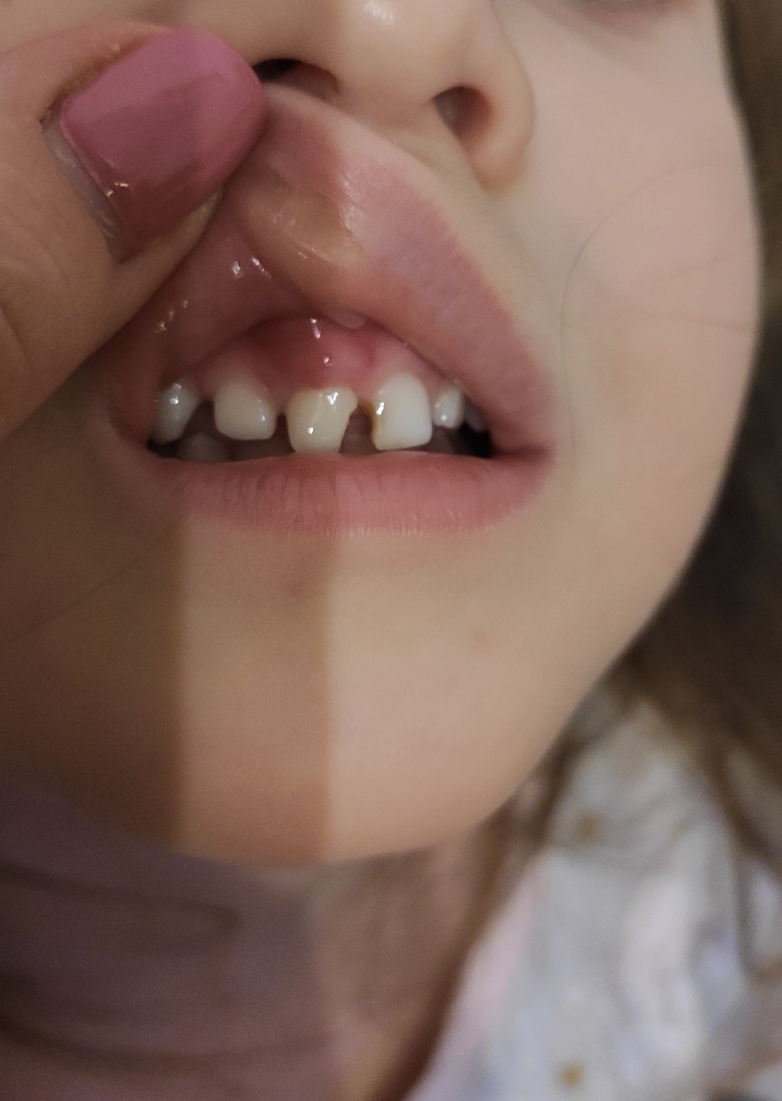 ako iste vidíte na fotke, dcéra má pomerne veľký kaz/defekt na zube. Tento kaz sa zjavne neriešil a zasiahol už zubný nerv. Následne zub odumrel a hnis sa hromadi okolo koreňa zuba. V tomto štádiu je už možnosťou len extrakcia zuba.