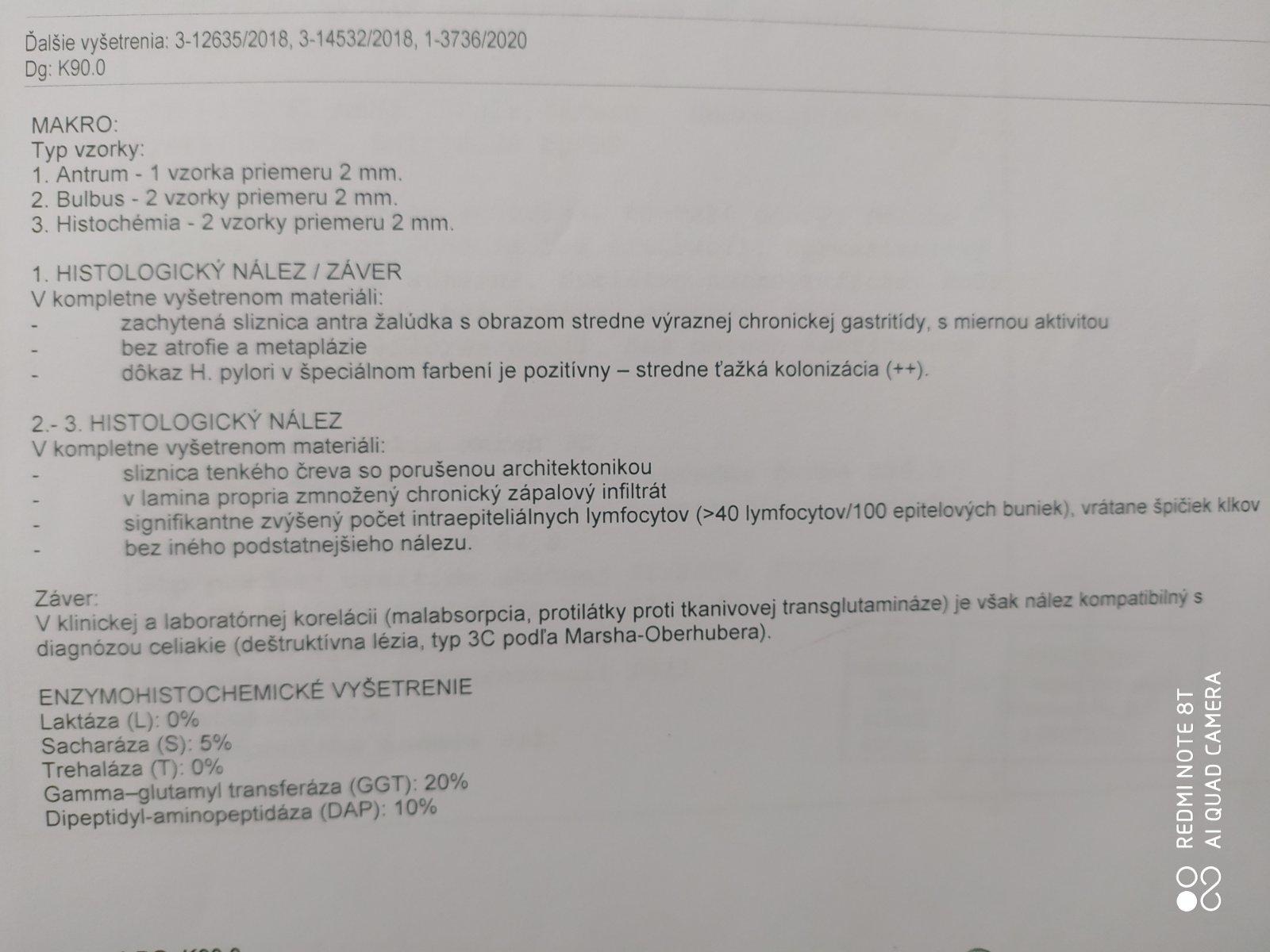 Taktiež je porušená výstelka tenkého čreva so zápalovou aktivitou, z čoho vyplýva znížená vstrebateľnosť živín a nízka funkcia enzýmov (ktorých hodnoty máte vypísane a sú takmer nulové).