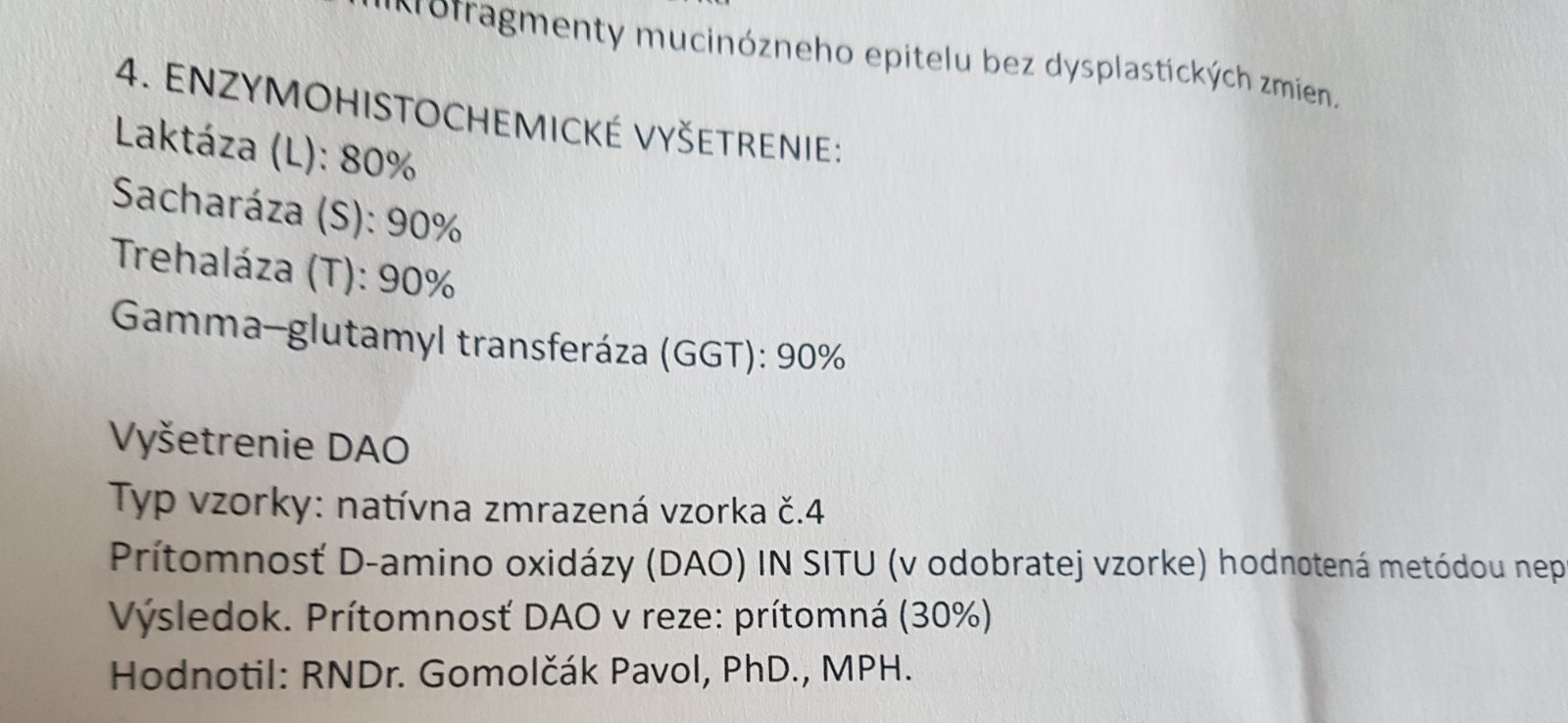 histologický odber z dvanástnika poukazuje na správnu funkciu sledovaných enzýmov okrem zníženej Diaminooxidázy. Odborná literatúra tvrdí, že pri učení diagnózy histamínovej intolerancie je okrem takéhoto výsledku dôležitá aj klinika. Myslí sa tým, či sú prítomné aj klinické prejavy, ktoré sa prejavujú podobne ako alergia.