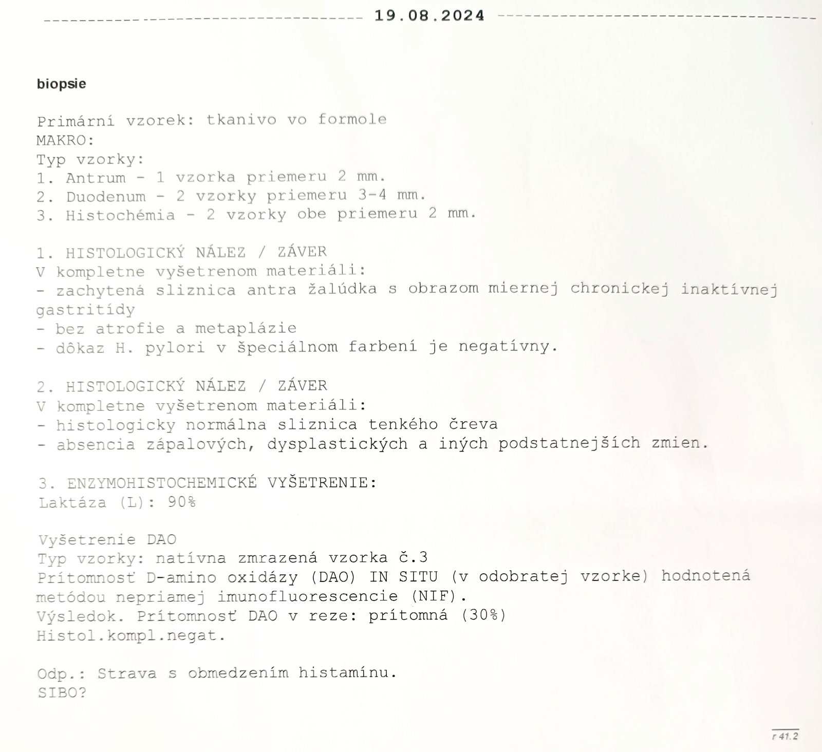 dnes som dostala do ruky svoje výsledky z gastrofibroskopie. Sestrička povedala, že je všetko v poriadku, ale odporúčajú mi test SIBO. Objednali ma na rektoskopiu, tak tomu nerozumiem. V správe je aj uvedené odporúčanie na stravu s obmedzením histamínu.