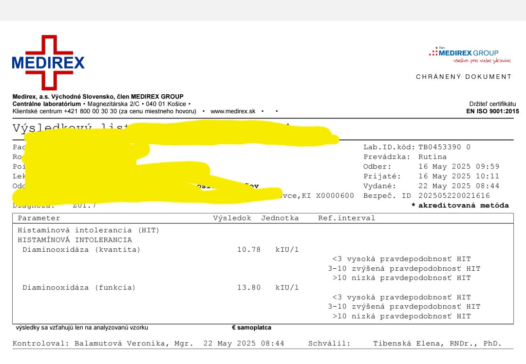 Podľa tohto výsledku máte množstvo aj funkciu enzýmu DAO (rozkladá histamín v trávení) nad hladinu 10, teda záverom je nízka pravdepodobnosť HIT.