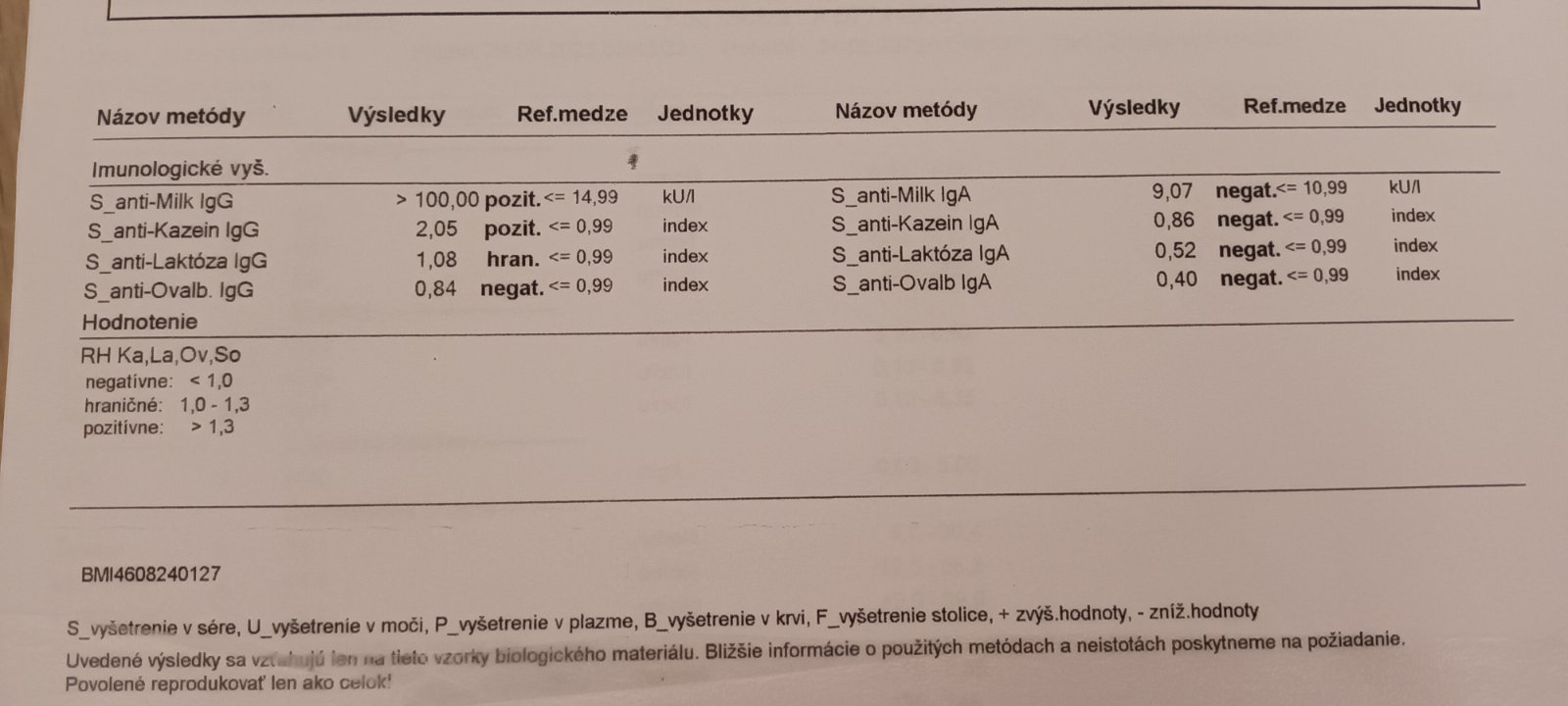 vo výsledkoch je pozitívna intolerancia na celú molekulu mlieka aj na bielkovinu kazeín.Testy na alergiu na BKM nevidím. Tá sa sleduje prostredníctvom protilátok IgE.