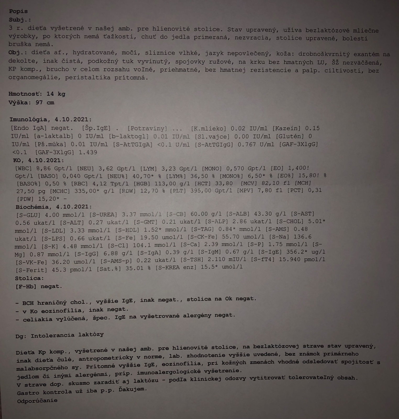 3,5 ročná dcérka mala minulý rok v lete hlienovité kašovité stolice. Bolo to v období zmrzlín a mne sa zdalo, že to má zo zmrzliny. Trvalo to asi 4 mesiace kým sme sa dostali na gastro. Výsledky prikladám v prílohe.