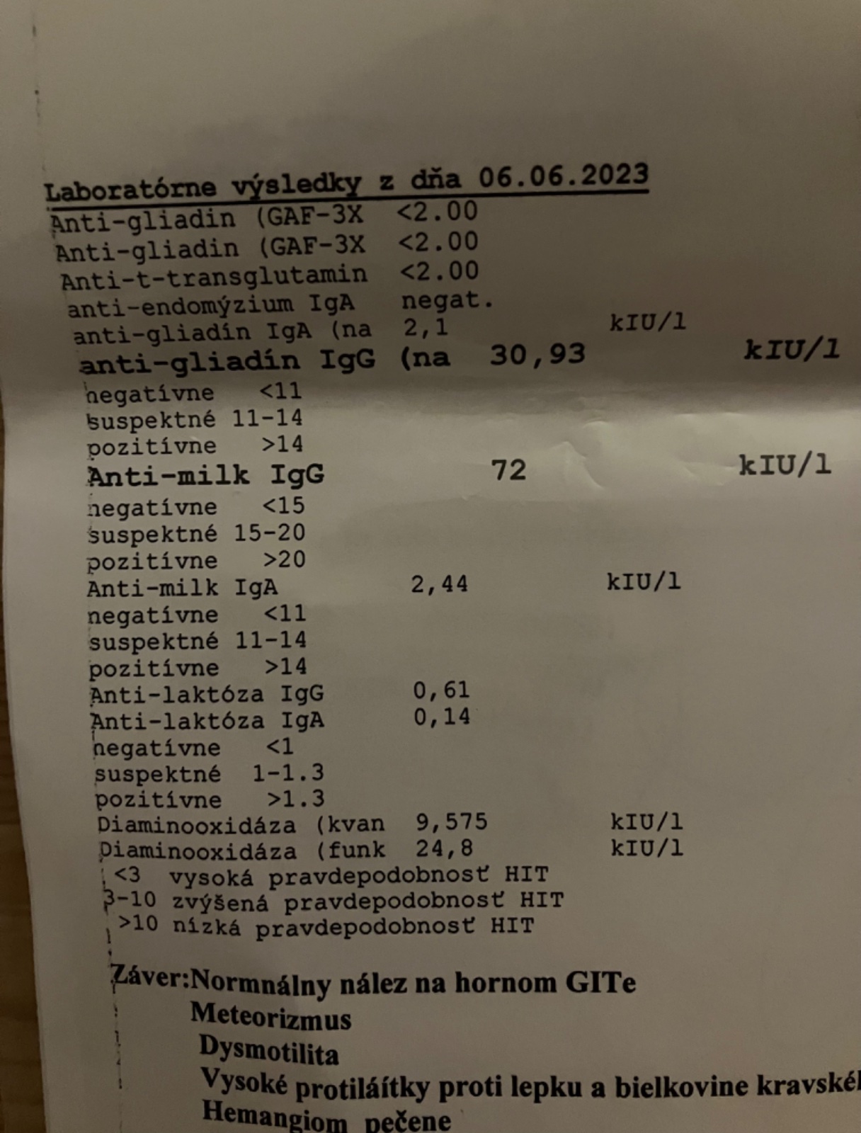 hodnoty anti-gliadínu naznačujú intoleranciu lepku.Hodnoty anti-Milk intoleranciu celej moleku mlieka.
