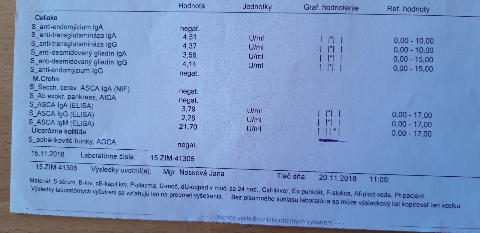 na gastrofibroskopii mi zistili Gerd-reflux, spomalenú molititu žalúdka a zapálený dvanástorník Marsh 1. Boli mi robené testy, všetky boli negatívne. A to aj parazity, potravinové alergie, celiakia z krvi. Tam mám jeden parameter zvýšený. Ide o Mr.Crohn SASCA IgM Elisa 21,70.
