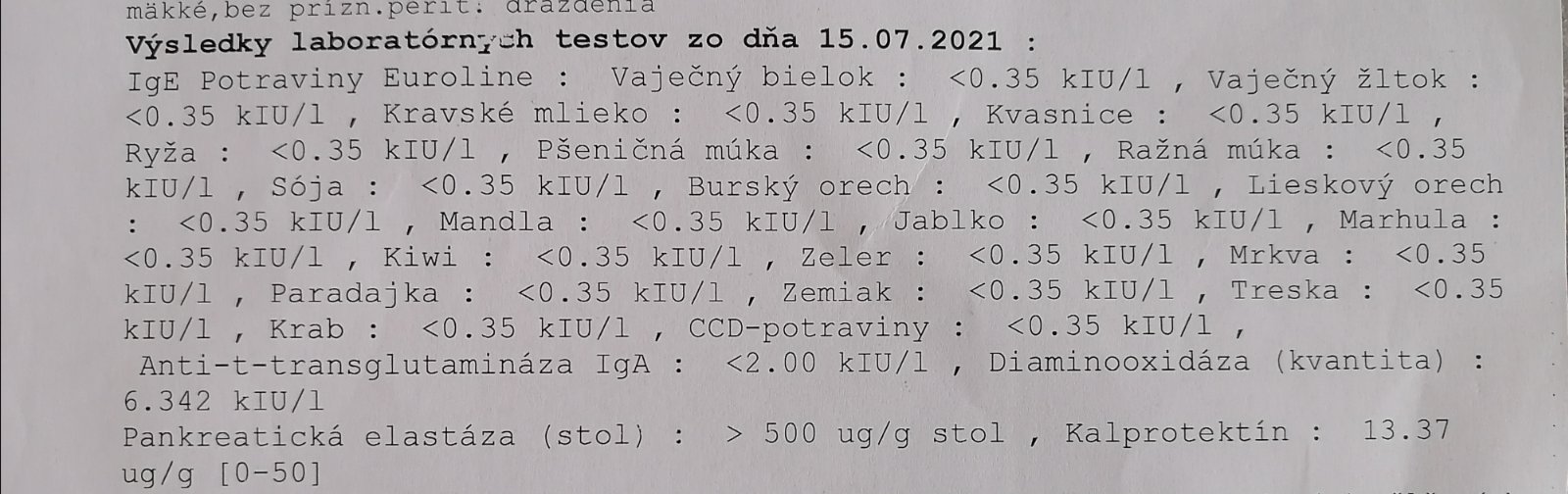výsledky, ktoré ste priložili obsahujú testy na potravinové alergie, tiež intoleranciu na lepok. To je negatívne. Taktiež pankreatická elastáza a marker na zápaly v čreve (kalprotektín) je v norme.