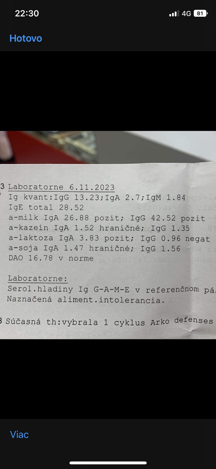 vo výsledkoch je napísane okrem hraničného výsledku na protilátky IgA kazeín (mliečna bielkovina), IgG laktóza a IgA sója aj pozitívne výsledky. Pozitívne sú IgA a IgG milk - teda celé mlieko a zároveň IgA Laktóza.
