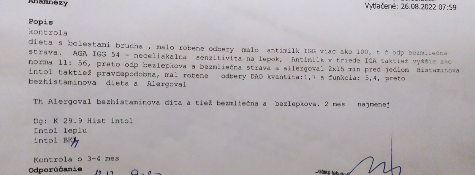 V máji 2022 u alergológa mal robené testy, kde mu vyšiel histamín, celiakia nie. Teraz má 4,5 roka a v auguste 2022 mal opakované testy u gastroenterológa. Opäť mu vyšli vysoké hodnoty na IBKM + mu potvrdil sa histamín a pribudla intolerancia na lepok.
