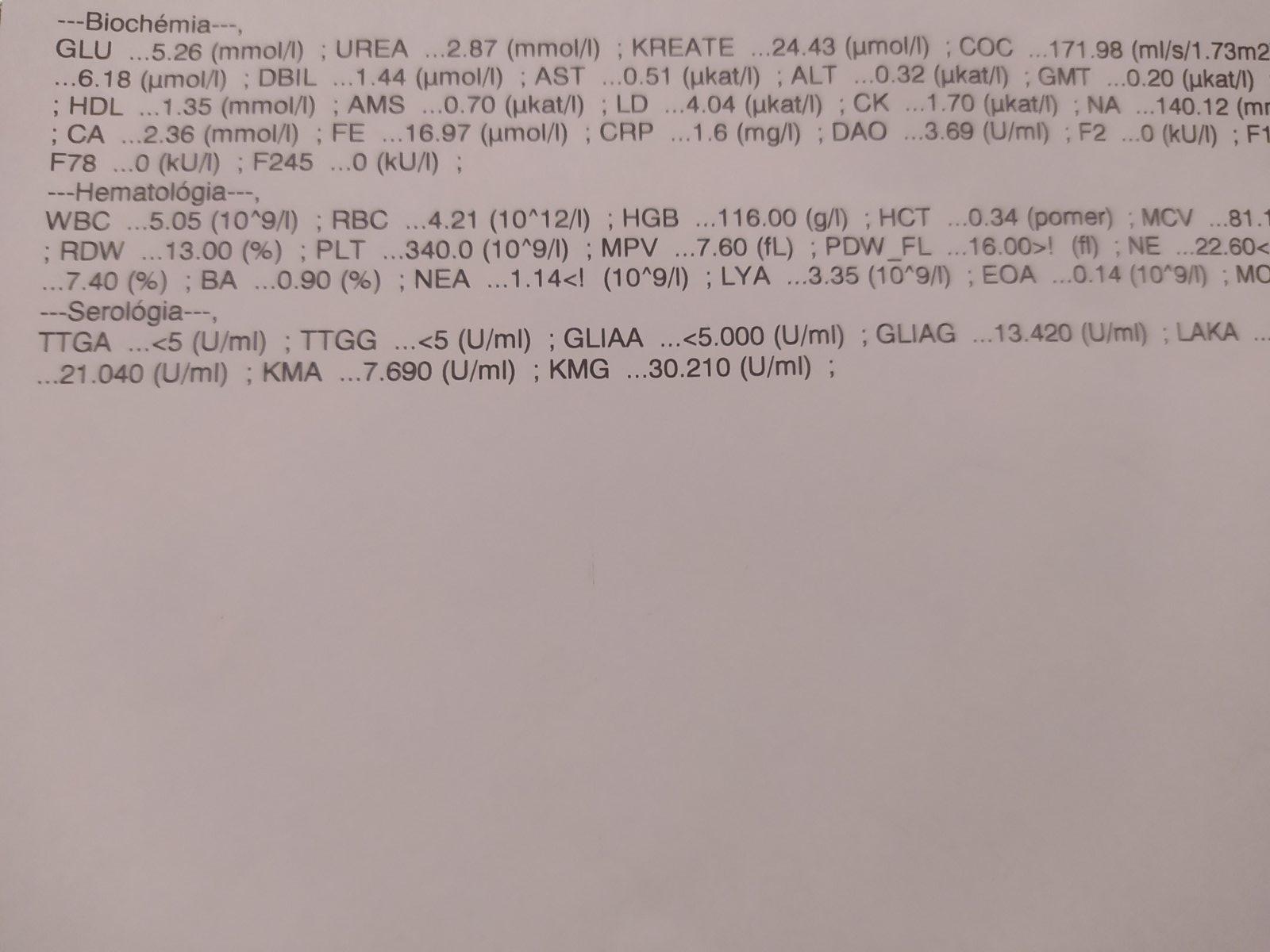 hodnoty na intoleranciu lepku nie su 5, ale sú menšie ako 5. To znamená, že sú negatívne. Hodnota diaaminoxidazy z krvi je dosť nízka a naznačuje zvýšené množstvo histamínu v krvi. Dôvodom môže byť aj intolerancia na laktózu alebo mlieko, tiež napr. vajíčka alebo sóju. Skúste ešte požiadať o ďalšie vyšetrenia - intolerancie potravín.