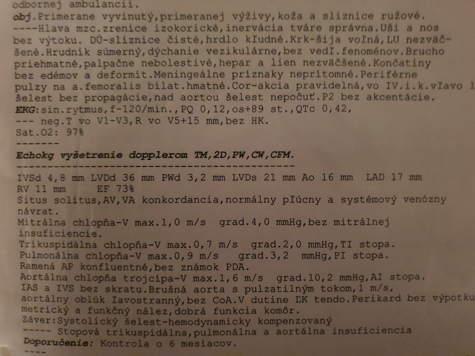 podľa správy má Vaše dieťa nezávažné nedovieravosti na viacerých chlopniach. V ľavej komore má šľašinku, kde prietok krvi okolo nej pravdepodobne spôsobuje šelest.