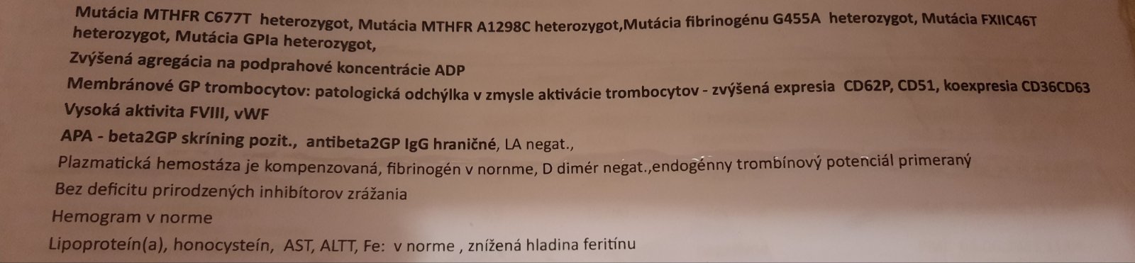 2x som spontánne potratila. 1x v 5. týždni, druhýkrát v 6. týždni. Absolvovala som takéto vyšetrenia: endokrinológia, genetika s manželom, reprodukčná imunológia a hematológia. Všetky výsledky sú v poriadku, ale hematológia nie je. Našli mi tam 5 mutácií a ďalšie veci.