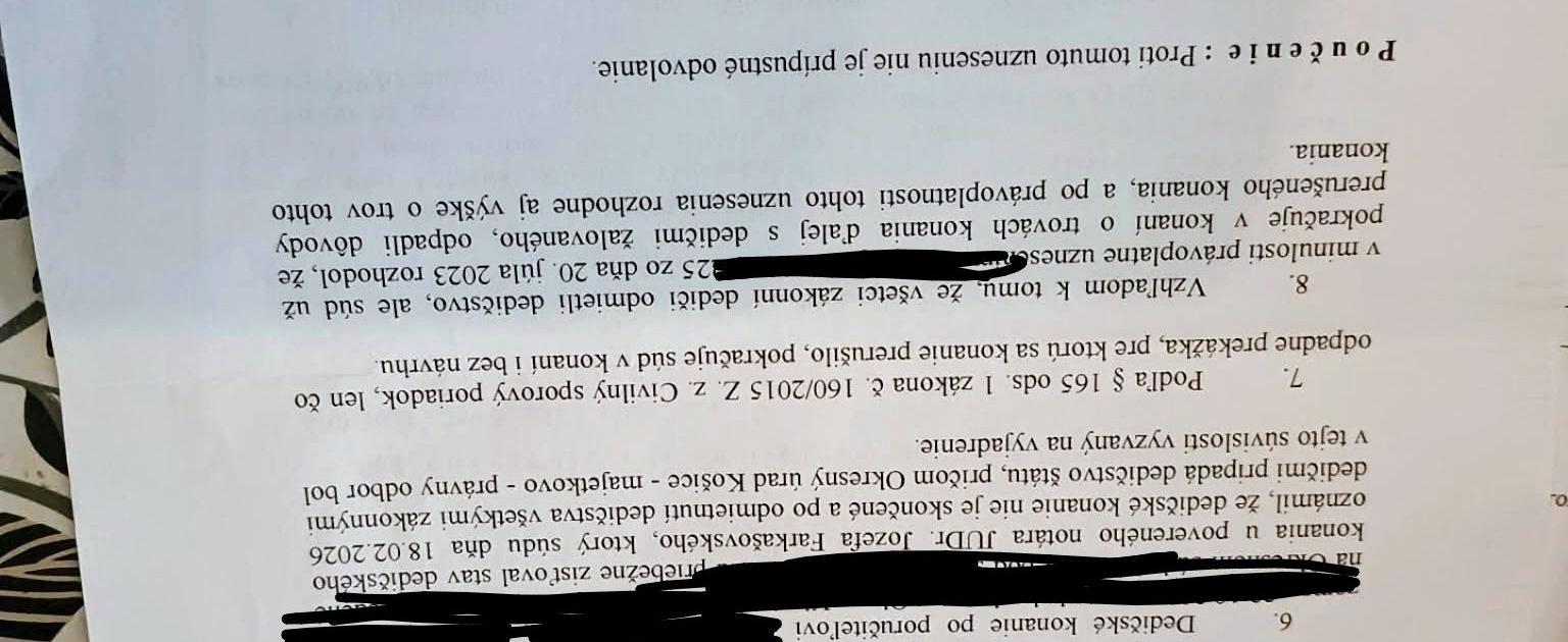 • alebo kombináciu výrokov (napr. pokračovanie v konaní, ale bez vyriešenia otázky dedičstva).