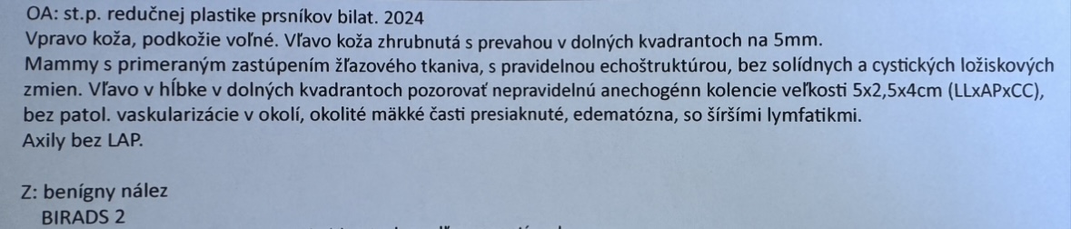 pred 2 mesiacmi som podstúpila zmenšenie prsníkov. Na ľavom prsníku je od začiatku väčší opuch, je tam hematóm. Už raz mi z toho prsníka odsávali, no opäť sa vrátil do stavu ako predtým.