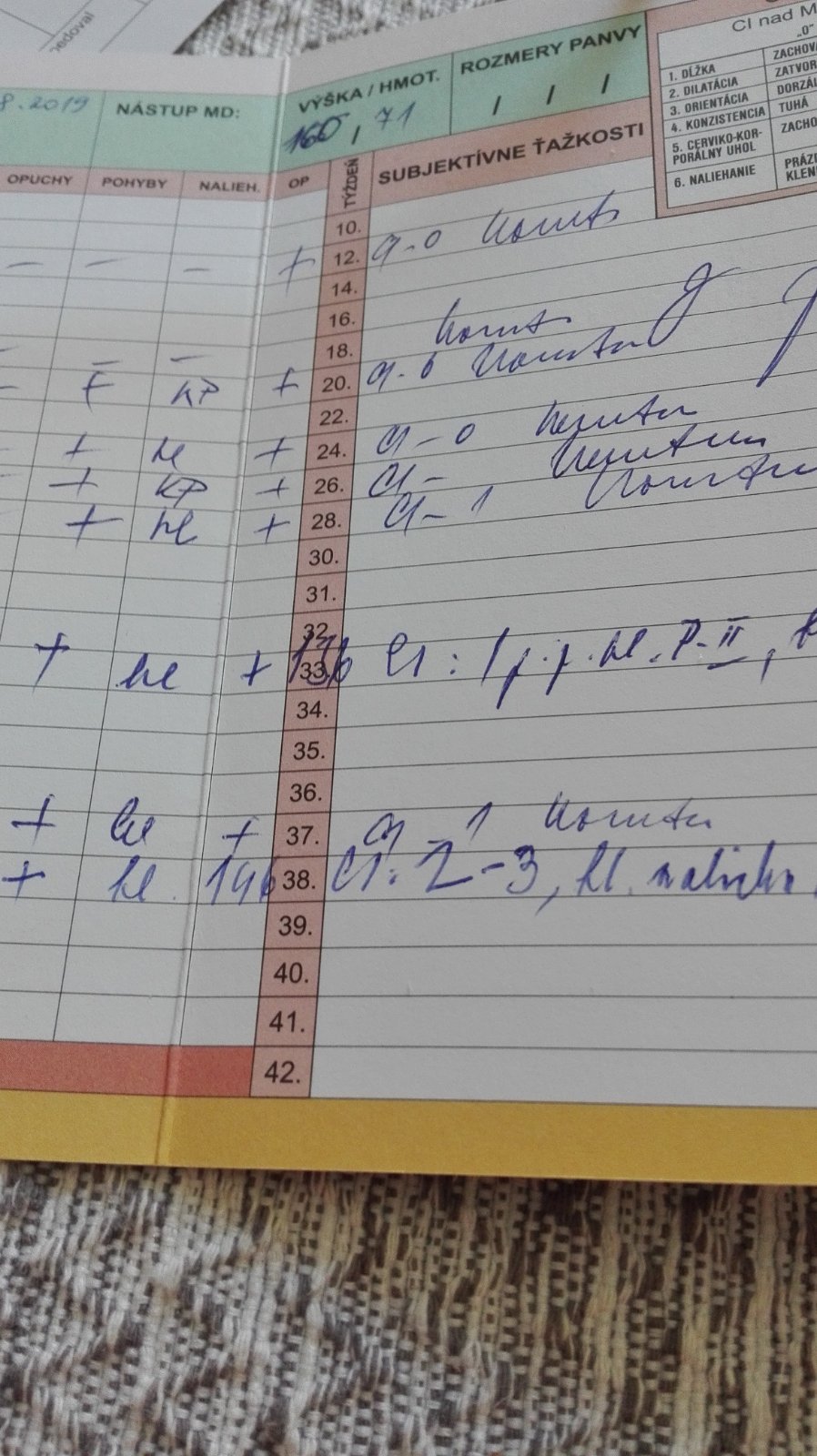 Ďalej je popísaná poloha plodu . Hlavička naliehá tj. dieťa je otočené hlavičkou dole. OP sú ozvy plodu, t.j. srdcová akcia 146/min. je norma.