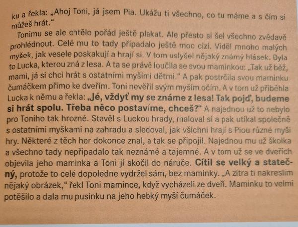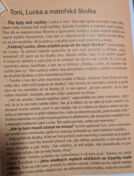 Od začiatku trochu plakával, ale posledné týždne to je oveľa horšie. Mali sme svoj rituál - pusa, vystískať, zakývať. Už sa rituál robiť nedá, keďže vyvádza. Učiteľka hovorí, že doobeda sa veľmi nechce zapájať, ale poobede sa už s deťmi hrá. Cestou domov sľubuje, že už plakať nebude. Keď sa ho pýtame, prečo to robí, tak nevie.