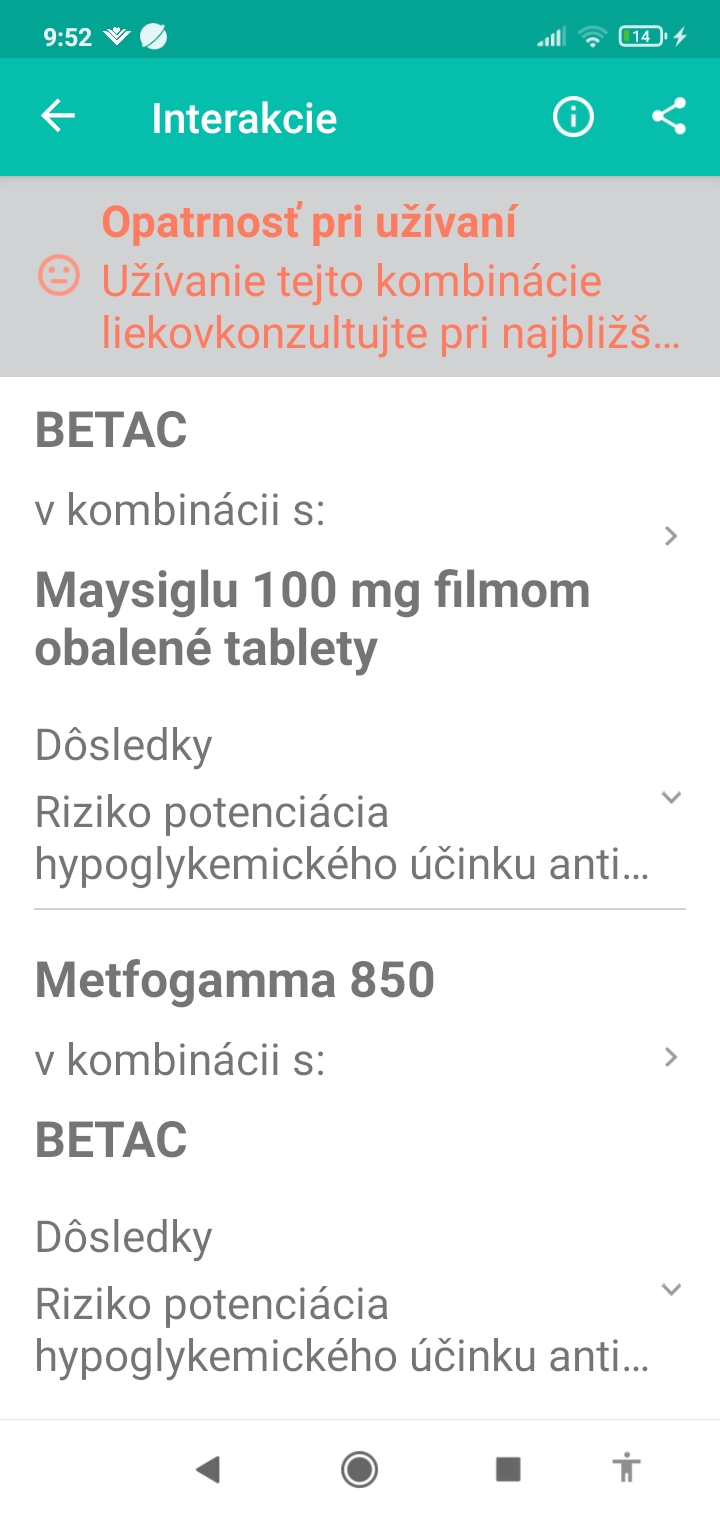 ide o interakciu strednej závažnosti. Betac môže potenciovať hypoglykemický účinok lieku Maysiglu, rovnako aj lieku Metfogamma.