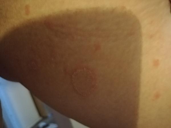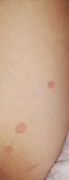 myslím si, že ide o tzv. Pityriasis rosea. Je to kožné ochorenie, pri ktorom sa ložisko v strede začína lúpať a po okrajoch sú biele šupiny.