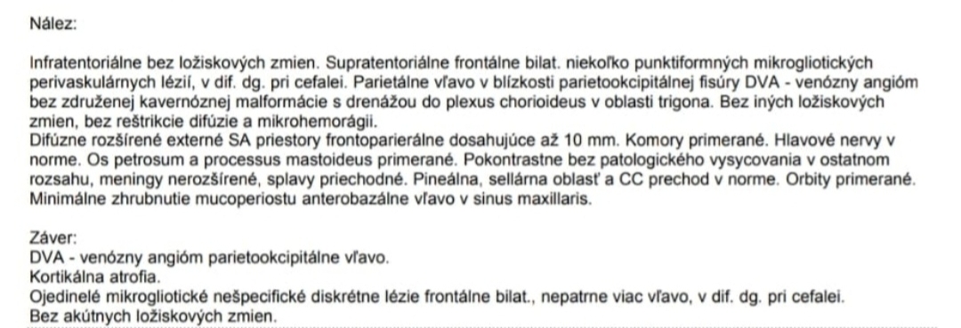 Dosť ma vystrašil hlavne záver "kortikálna atrofia". Pri hľadaní tohto výrazu mi totiž našlo desivé články o demencii a podobne. Mám 29 rokov a žiadne iné problémy okrem bolestí hlavy a úzkostí nemám.