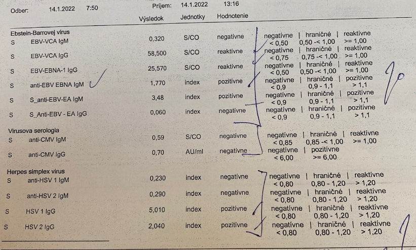 Boli mi robené aj testy na vírusy, kde mi vyšli pozítívne viaceré hodnoty EBV v IGM. Kedysi som pritilátky už v IGG mala, čiže už som to niekedy prekonala. Ale nejako asymptomaticky, lebo chorá som nebola. Doktor tvrdí, že som to musela chytiť cca pol roka dozadu.