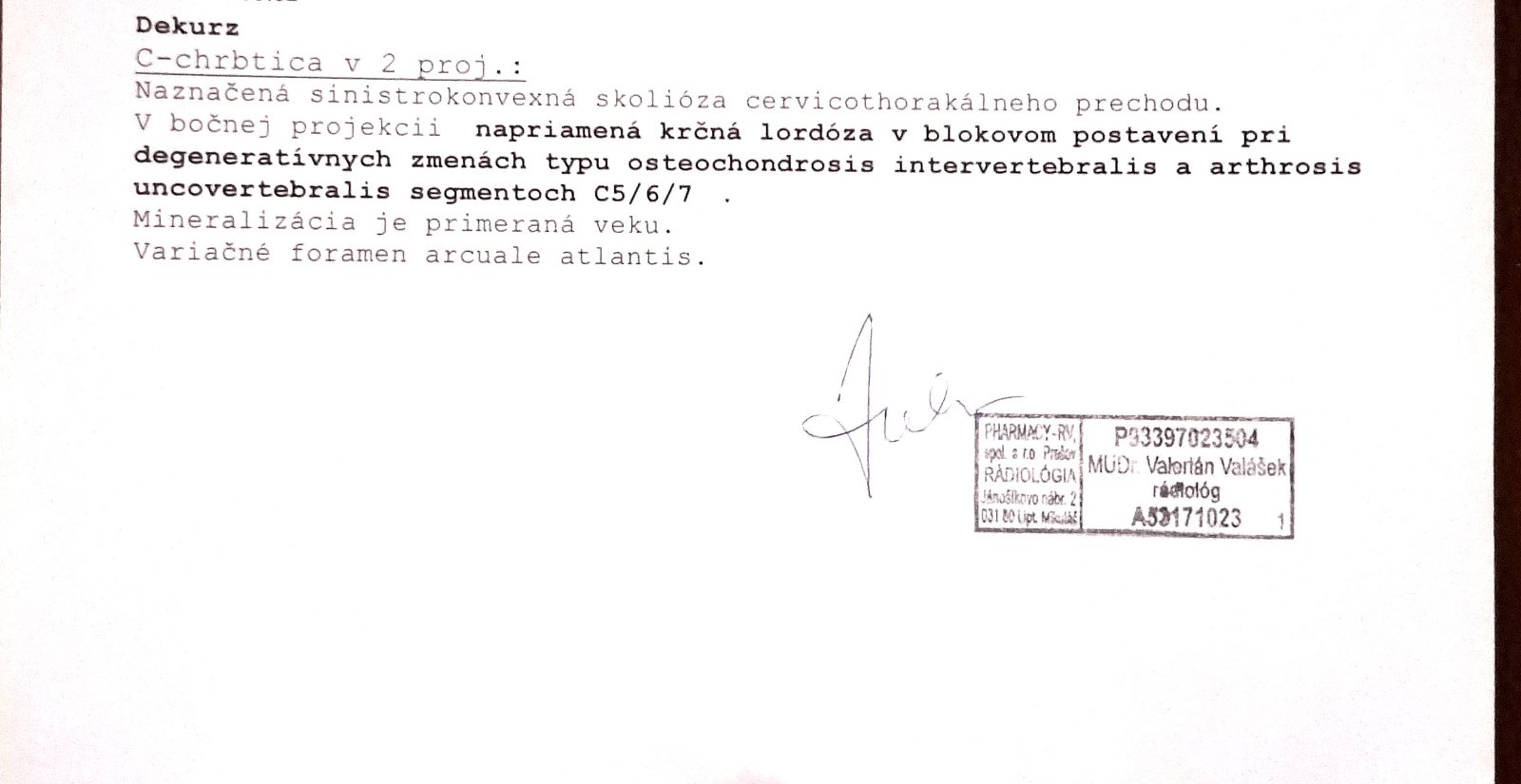 podľa RTG popisu sú prítomné zmeny v medzistavcových platničkách, kvôli tomu je krčná chrbtica naklonená viac dopredu. Na bližšie popísanie stavu medzistavcových platničiek je potrebné doplniť MR krčnej chrbtice.