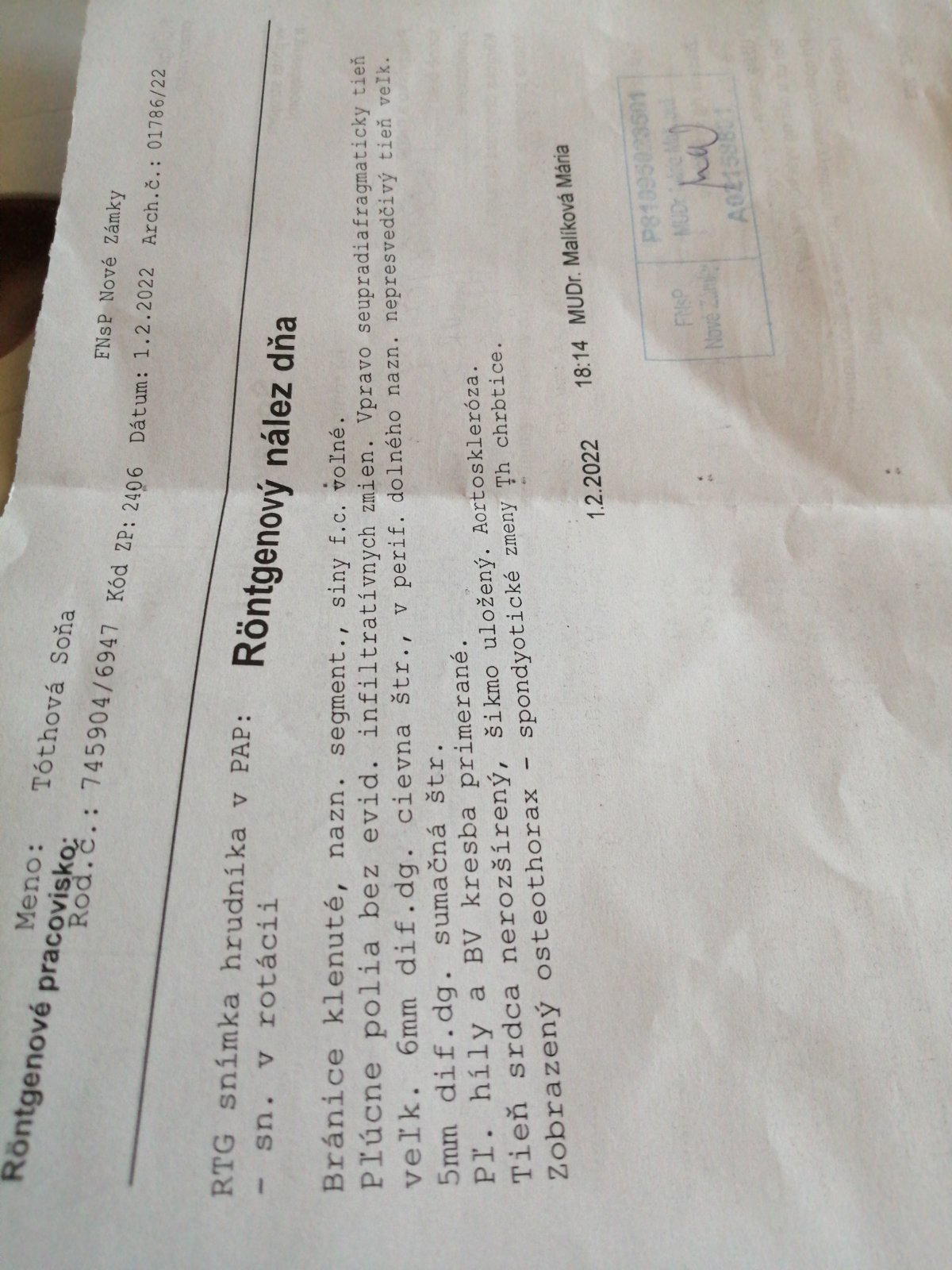 RTG hrudníka máte v poriadku. Vedľajším nálezom je prítomnosť degeneratívnych zmien na hrudných stavcoch.