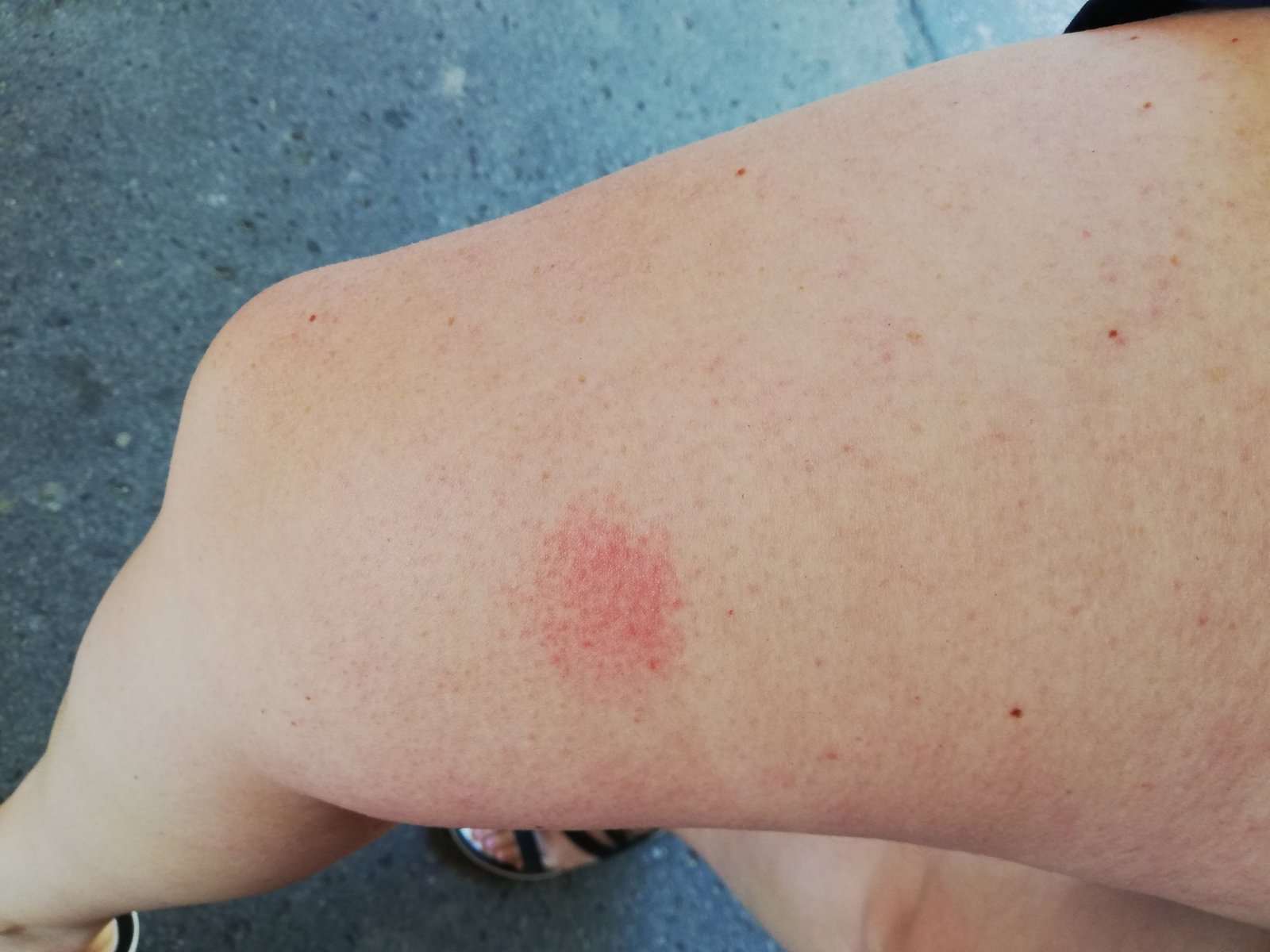 včera som si našla na stehne takýto fľak. Je umiestnený nad kolenom, nesvrbí ma a nie je vypuklý. Alergia na slnko to nebude, keďže do tej časti mi ani slnko nesvietilo. Ani ošúchnuté to nemám.