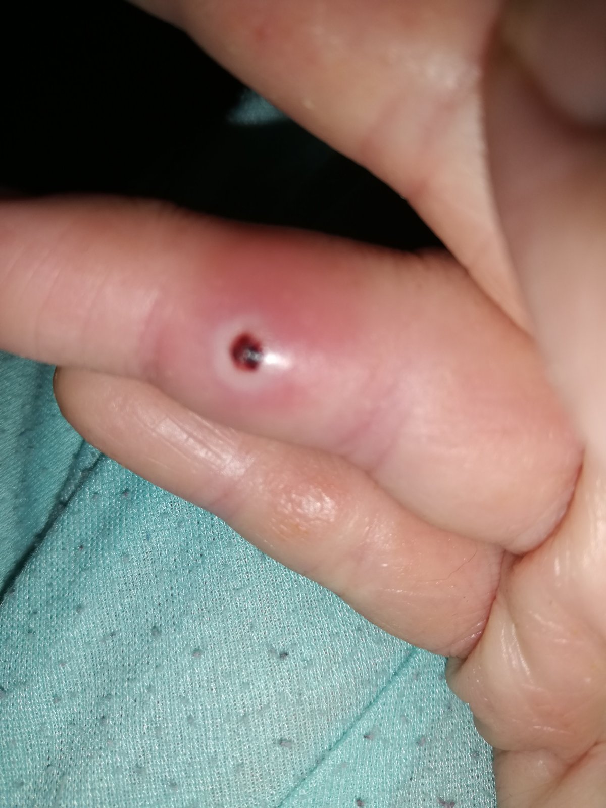 v piatok sa mu urobil takýto pupák a bolí ma z toho celá ruka. Vytlačiť sa to nedá, ale veľmi to bolí aj pri jemnom dotyku. To červené vyzerá ako zrazená krv. Ráno som si všimla biele okolo toho. Prst som si nepricvikla nikde.