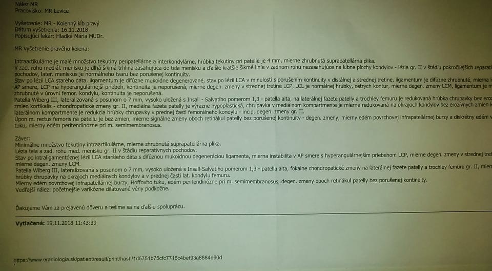Z popisu je zrejmé, že v danom kolene je poškodený meniskus, ďalej je tam aj prítomné staršie poškodenie LCA. Ide o predný skrížený väz kolena. Jabĺčko na kolene je mierne posunuté a chrupavka na ňom je mierne zmenená.