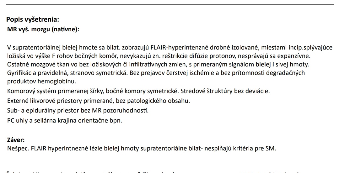 podľa MR popisu sú na mozgu prítomné nešpecifické lézie, ktoré momentálne nesvedčia pre žiadne ochorenie. Týmto vyšetrením sa vylúčila skleroza multiplex. Ide o ochorenie, ktoré sa v úvode často prejavuje tŕpnutím končatín.