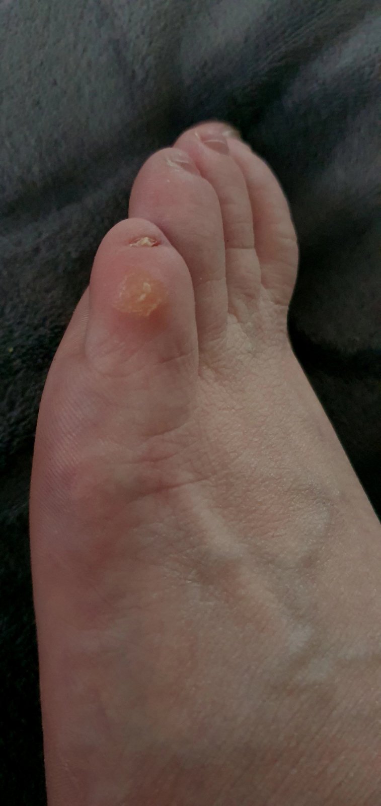 podľa fotografie to vyzerá ako otlak, ktorý je ale pravdepodobne zapálený. Žlté chrasty sú typické pre impetigo. Ak sa nález rozširuje, tak je potrebné ísť na dermatológiu. Ak máte cukrovku, tak je to potrebné riešiť ihneď.